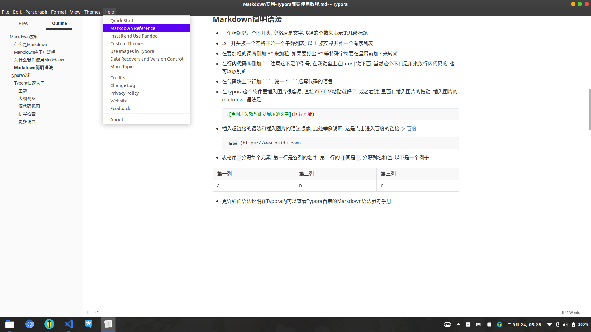 - 更详细的语法说明在Typora内可以查看Typora自带的Markdown语法参考手册